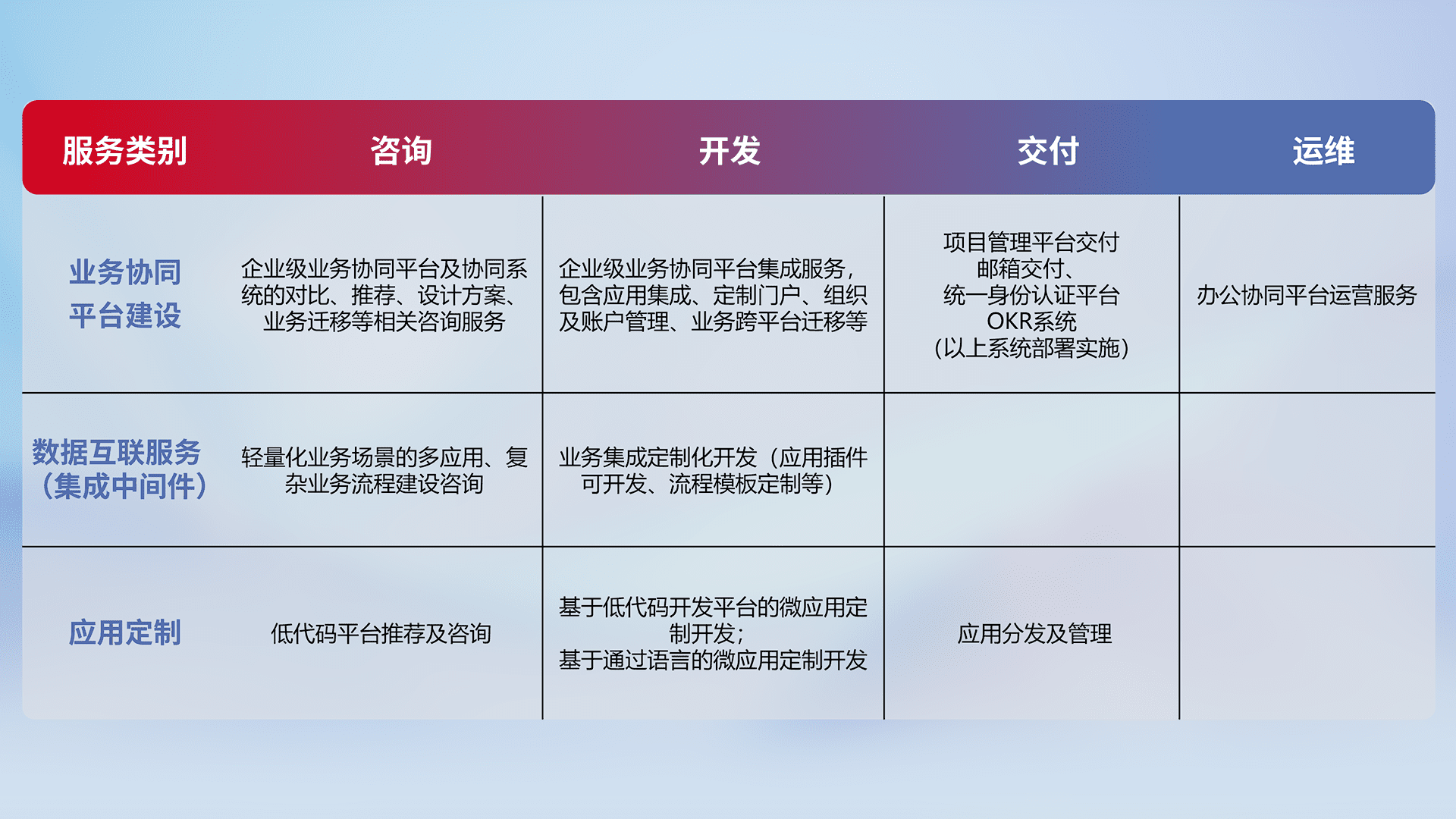 针对钉钉、、企微、、IDaas等平台级产品提供产品的规划、、、、方案、、、交付、、定制化开发等服务,,,实现如统一协同办公、、、、智能客户服务、、混合会议管理、、、智能数据查询、、、、等业务场景,,,实现数字化转型。。。。